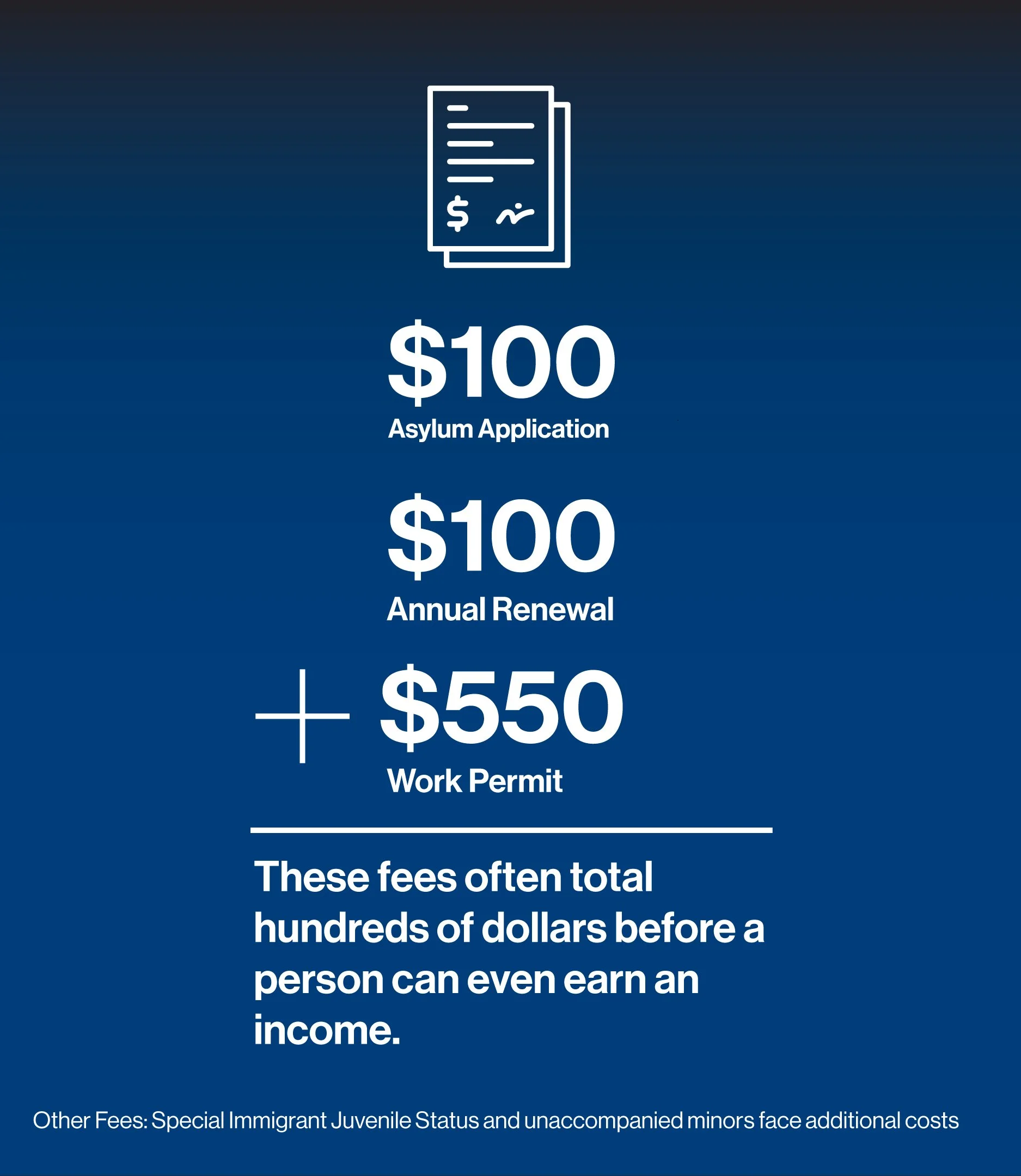 To apply for asylum, individuals must pay a $100 application fee and a $100 annual renewal fee. Cases can take years to process, leaving families in limbo.
